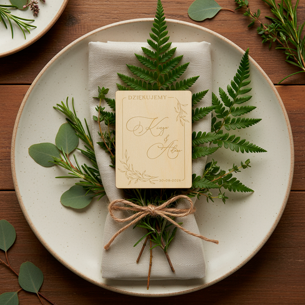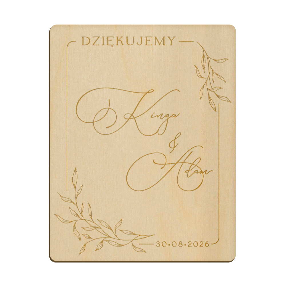 Drewniany magnes z grawerunkiem idealnie sprawdzi się w roli podziękowania dla gości weselnych.