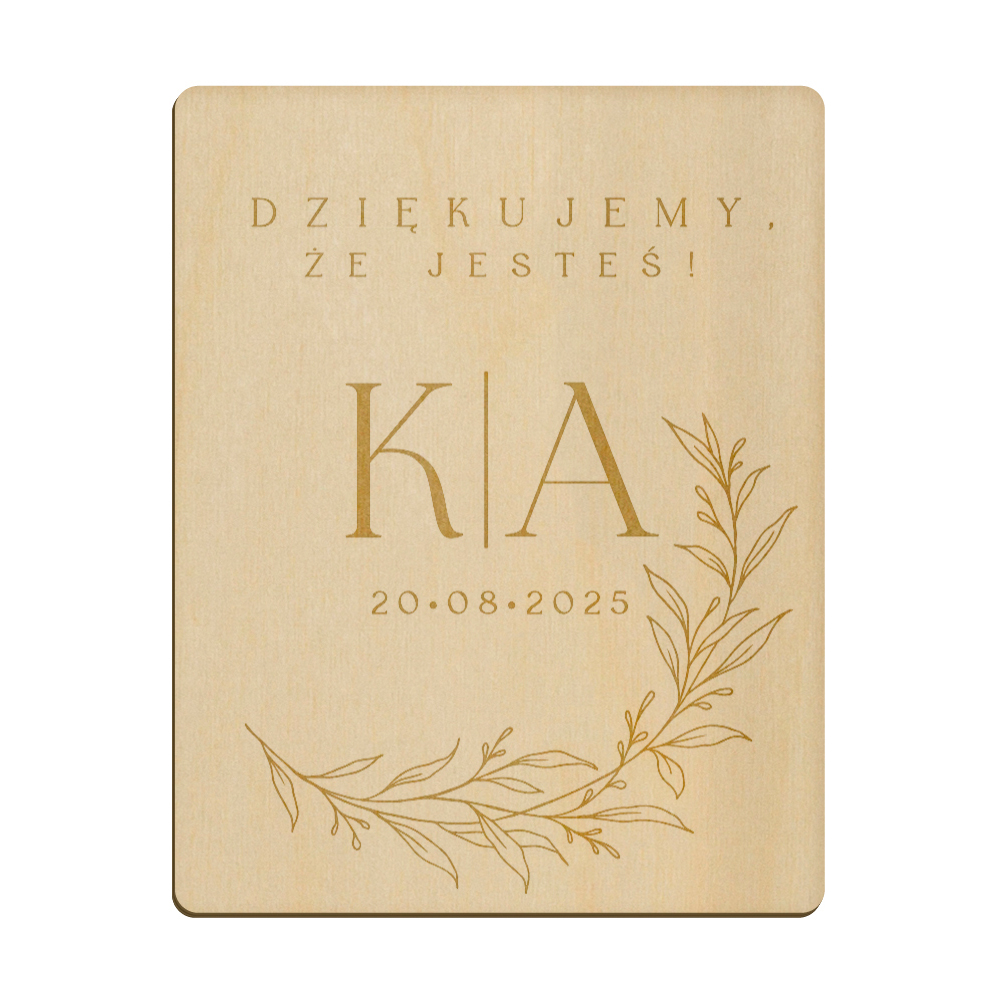 Drewniany magnes z grawerunkiem idealnie sprawdzi się w roli podziękowania dla gości weselnych.