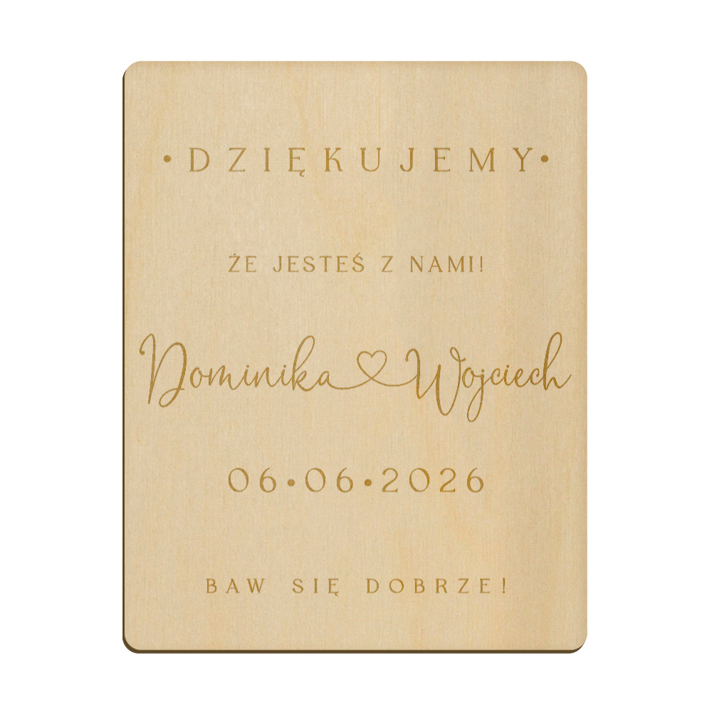Drewniany magnes z grawerunkiem idealnie sprawdzi się w roli podziękowania dla gości weselnych.