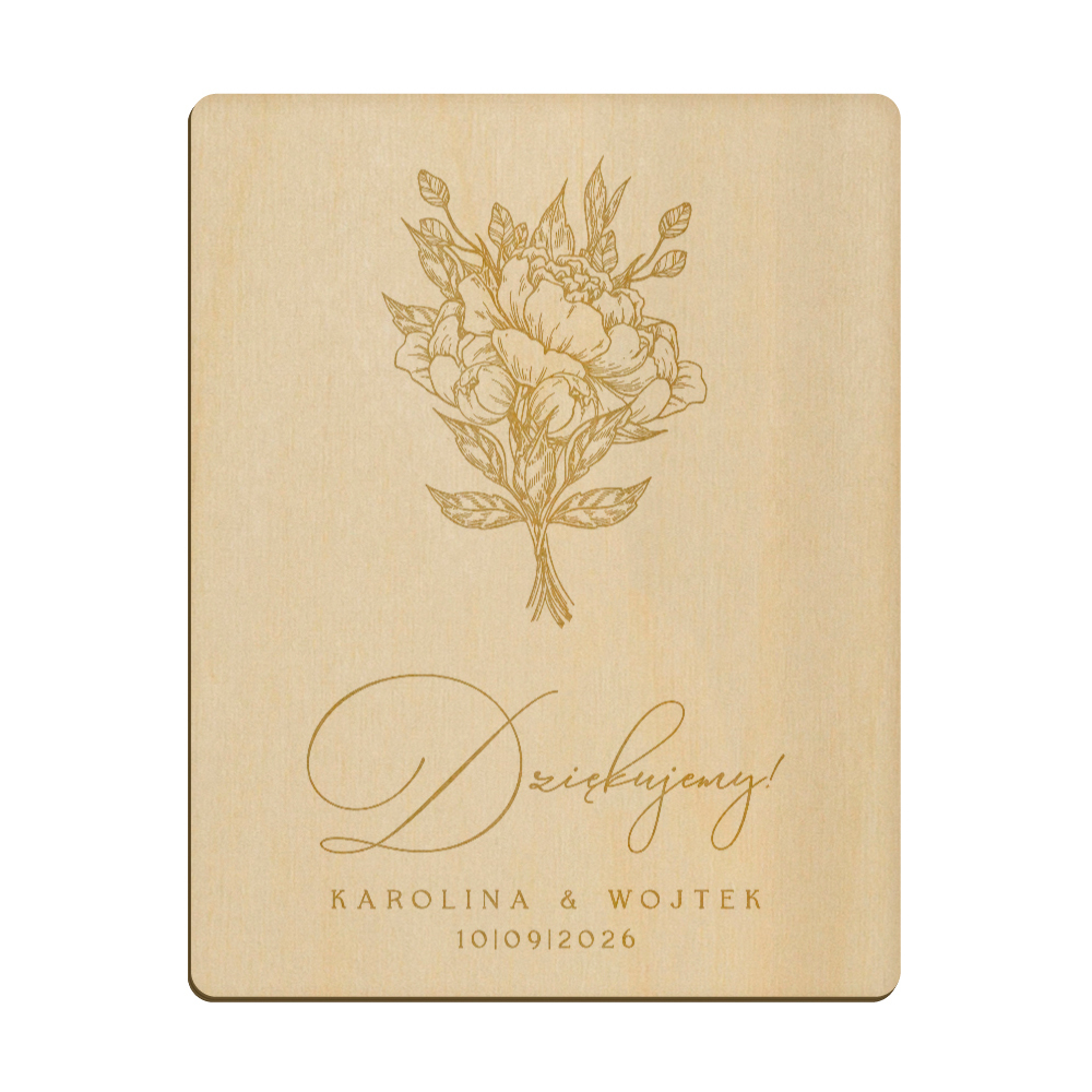 Drewniany magnes z grawerunkiem idealnie sprawdzi się w roli podziękowania dla gości weselnych.