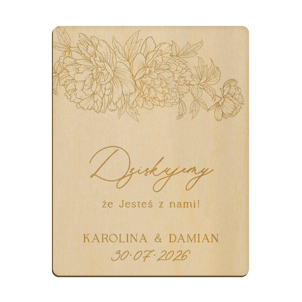 Drewniany magnes z grawerunkiem idealnie sprawdzi się w roli podziękowania dla gości weselnych.
