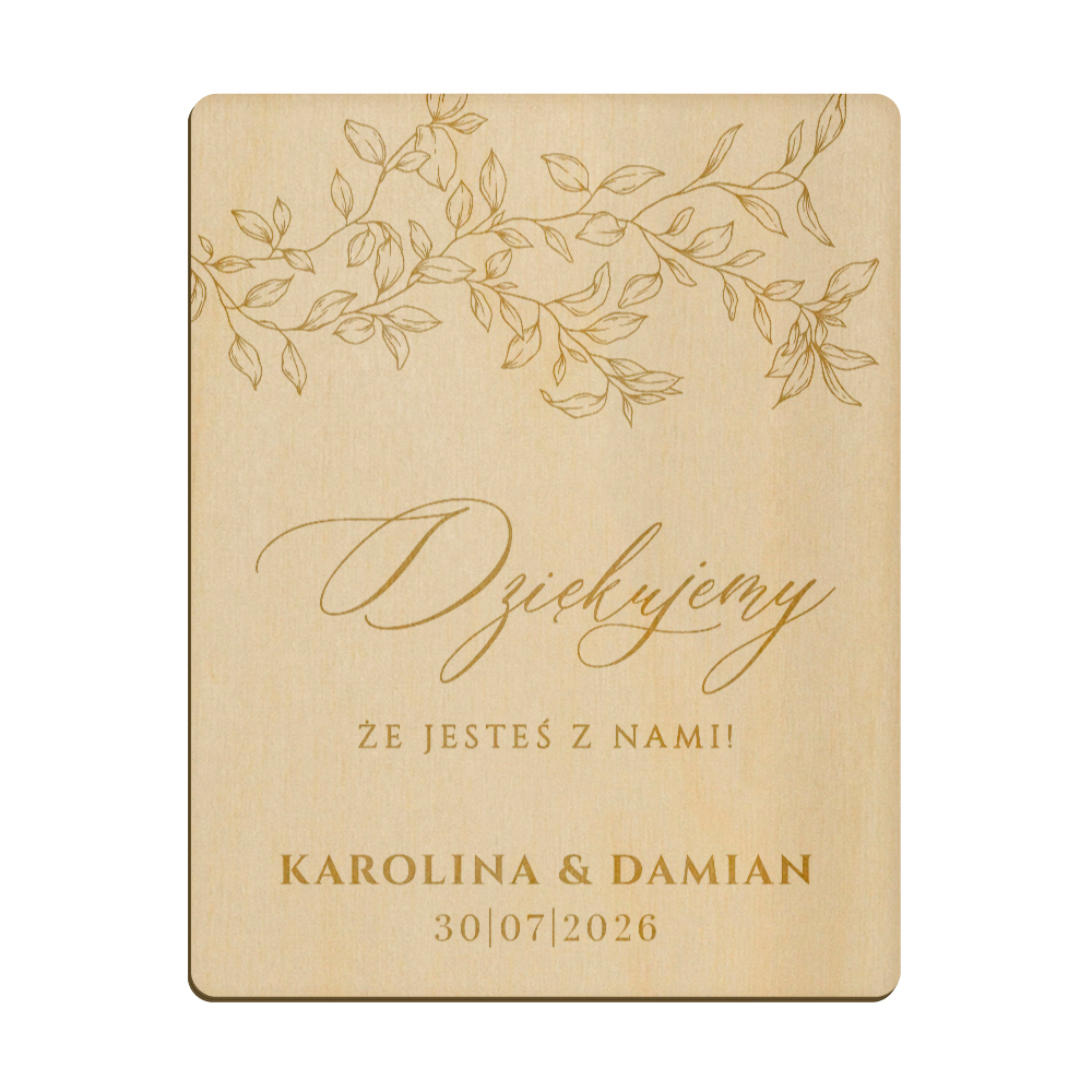 Drewniany magnes z grawerunkiem idealnie sprawdzi się w roli podziękowania dla gości weselnych.