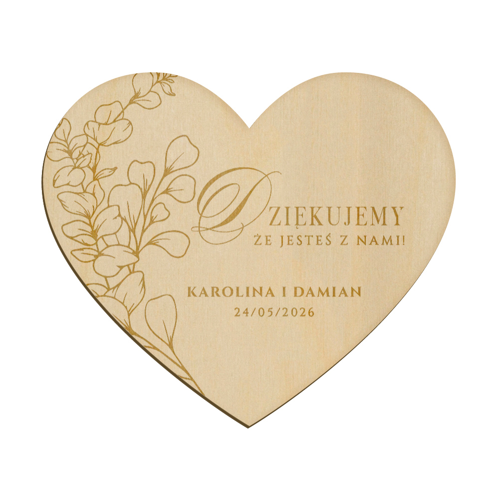 Drewniany magnes z grawerunkiem idealnie sprawdzi się w roli podziękowania dla gości weselnych.
