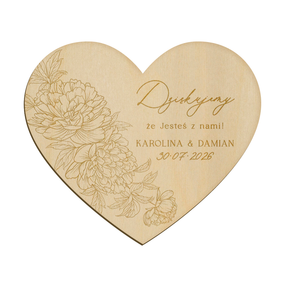 Drewniany magnes z grawerunkiem idealnie sprawdzi się w roli podziękowania dla gości weselnych.