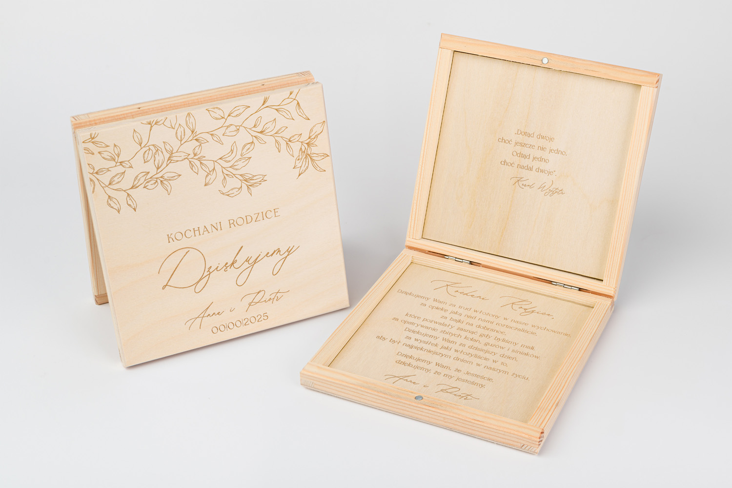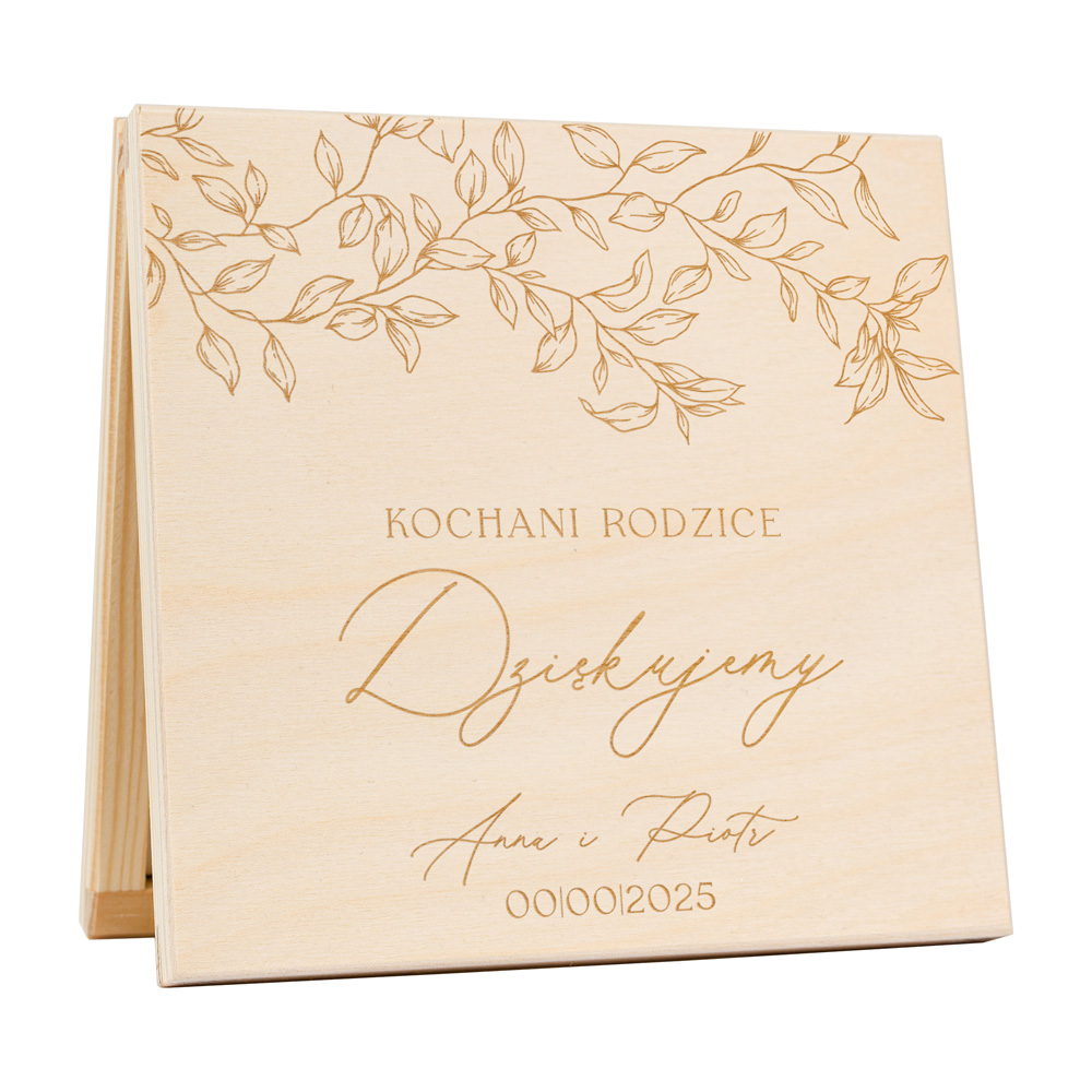 Dodaj pierwszą opinię dla Podziękowanie w drewnianym pudełku z grawerunkiem listki