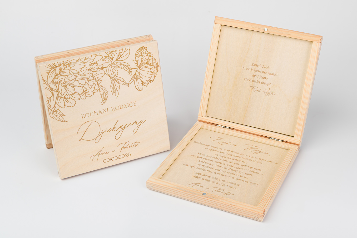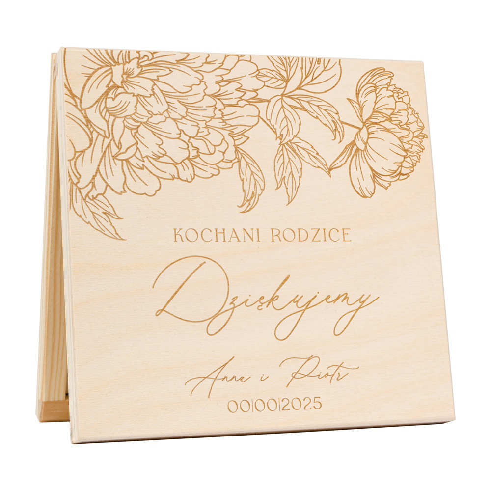 Dodaj pierwszą opinię dla Podziękowanie w drewnianym pudełku z grawerunkiem piwonie
