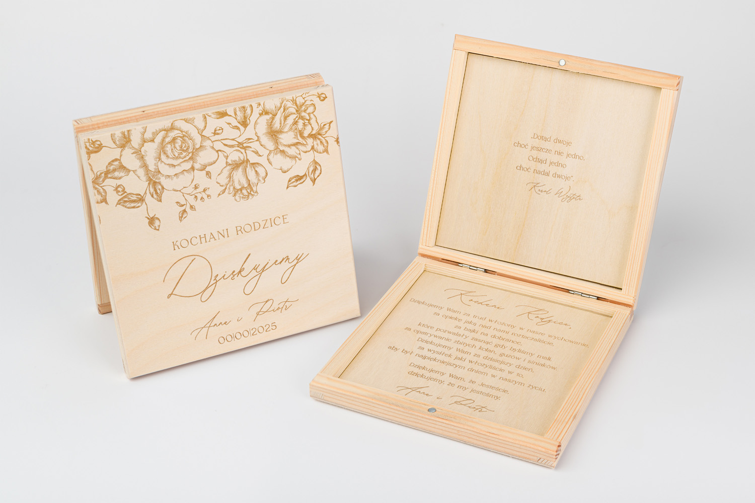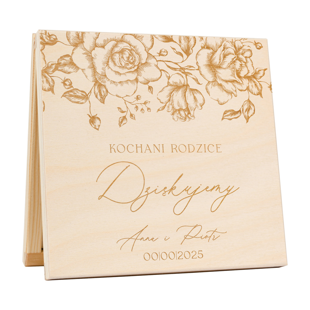 Dodaj pierwszą opinię dla Podziękowanie w drewnianym pudełku z grawerunkiem róże