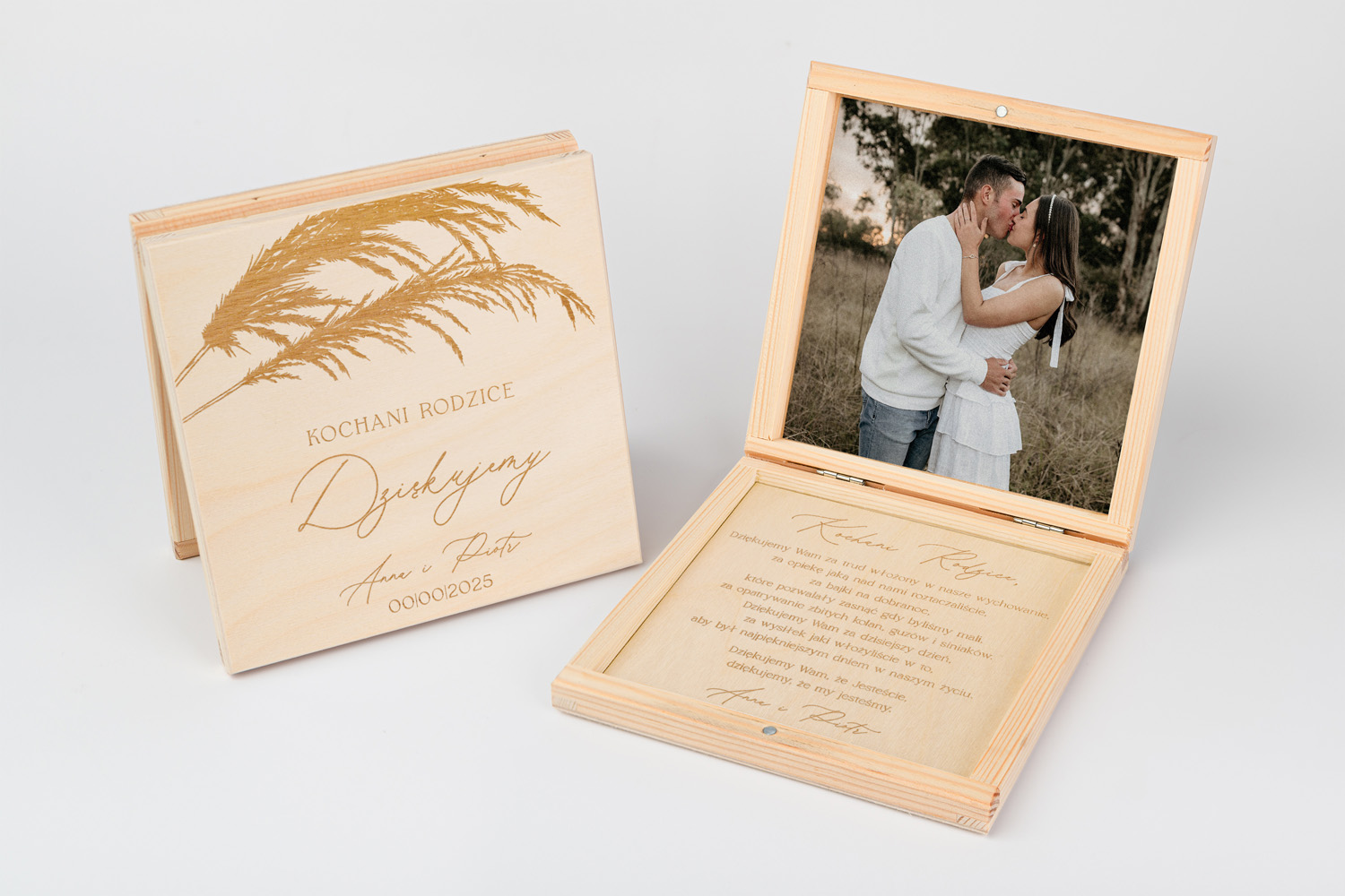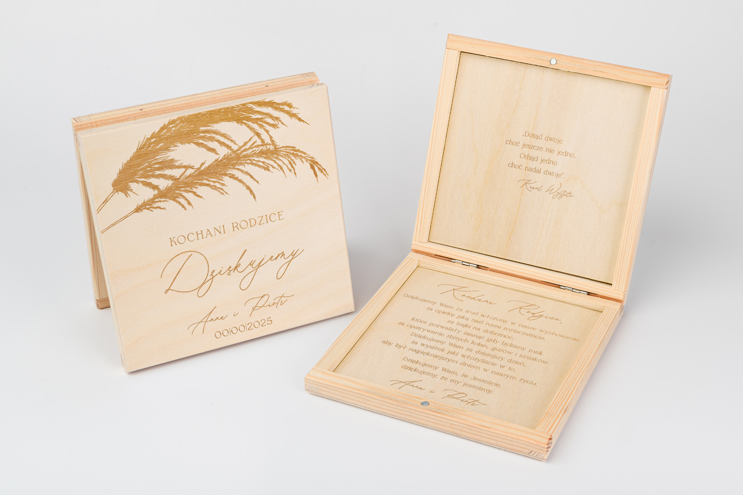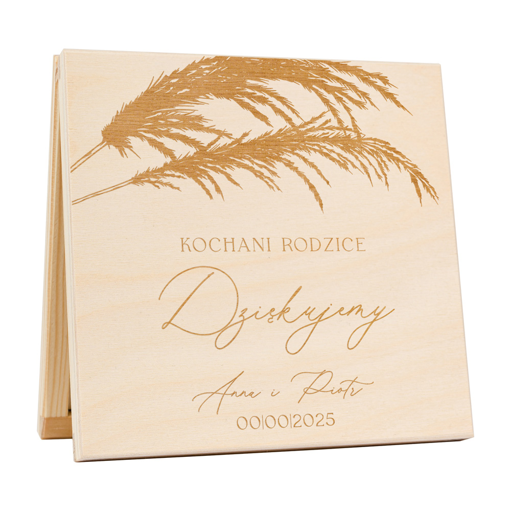 Dodaj pierwszą opinię dla Podziękowanie w drewnianym pudełku z grawerunkiem trawa pampas