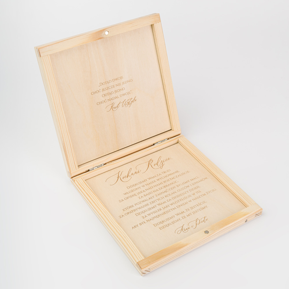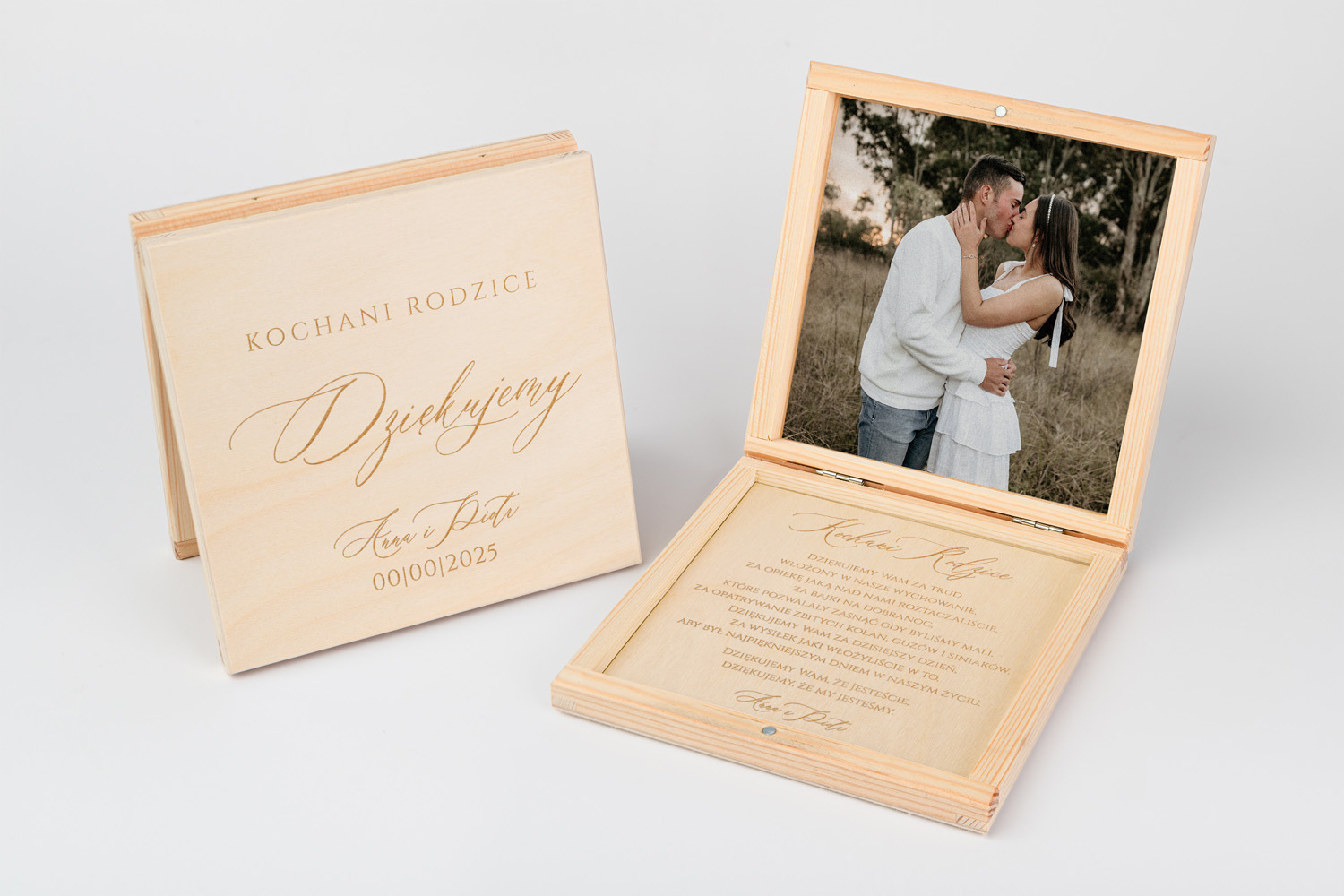 Drewniane pudełeczko to bardzo trwała forma spersonalizowanego upominku. Może służyć jako zaproszenie, prośba o błogosławieństwo lub podziękowanie. Tekst może być skierowany do różnych osób np.: rodziców, świadków, chrzestnych, dziadków lub innych ważnych dla Was osób, które chcecie obdarować taką pamiątką z tego wyjątkowego dnia.