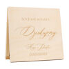Drewniana konstrukcja z pięknym nadrukiem będzie doskonale pasować do kwiatów, koszów i innych podziękowań wręczanych na przyjęciu weselnym.