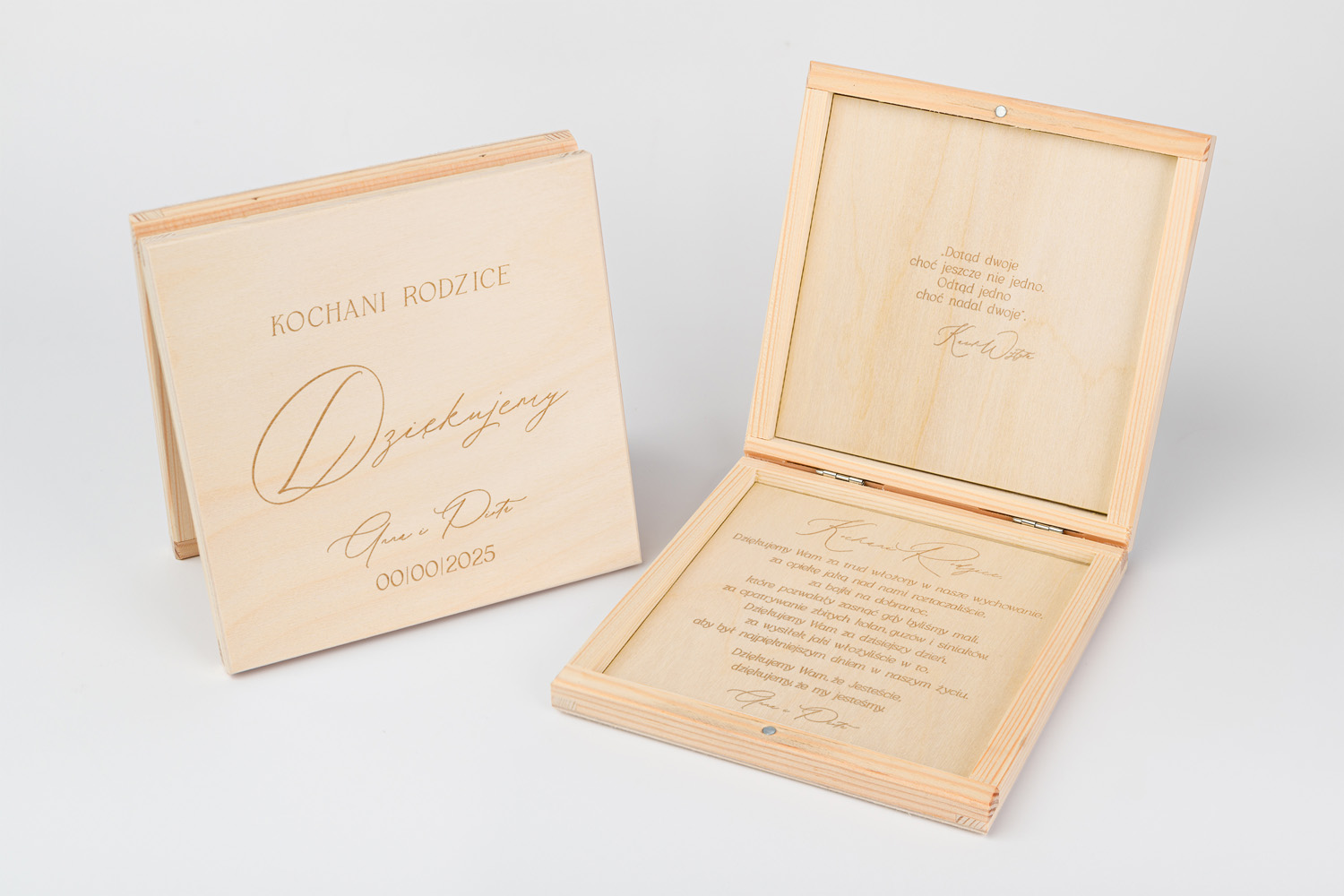 Drewniane pudełeczko to bardzo trwała forma spersonalizowanego upominku. Może służyć jako zaproszenie, prośba o błogosławieństwo lub podziękowanie. Tekst może być skierowany do różnych osób np.: rodziców, świadków, chrzestnych, dziadków lub innych ważnych dla Was osób, które chcecie obdarować taką pamiątką z tego wyjątkowego dnia.
