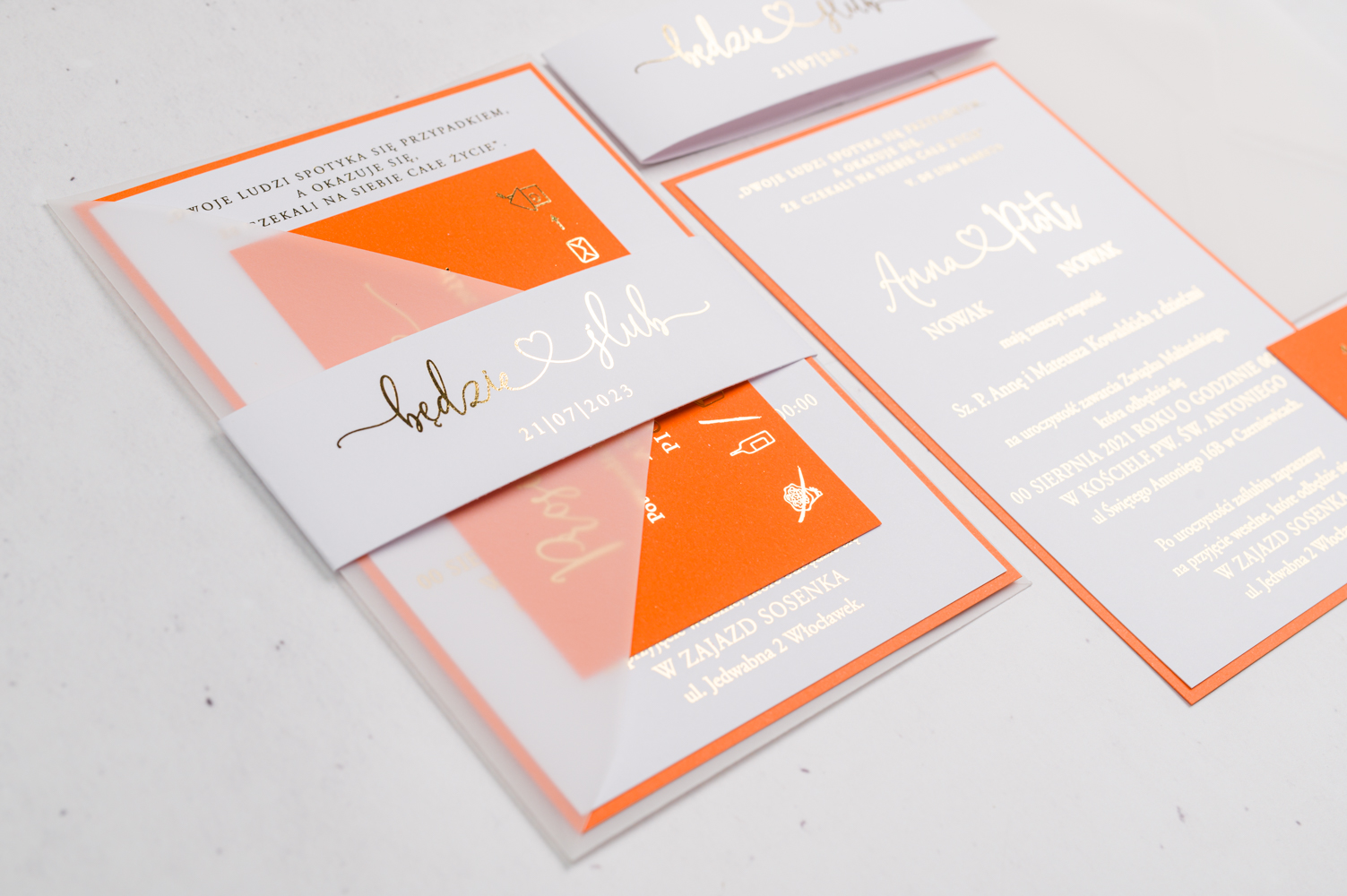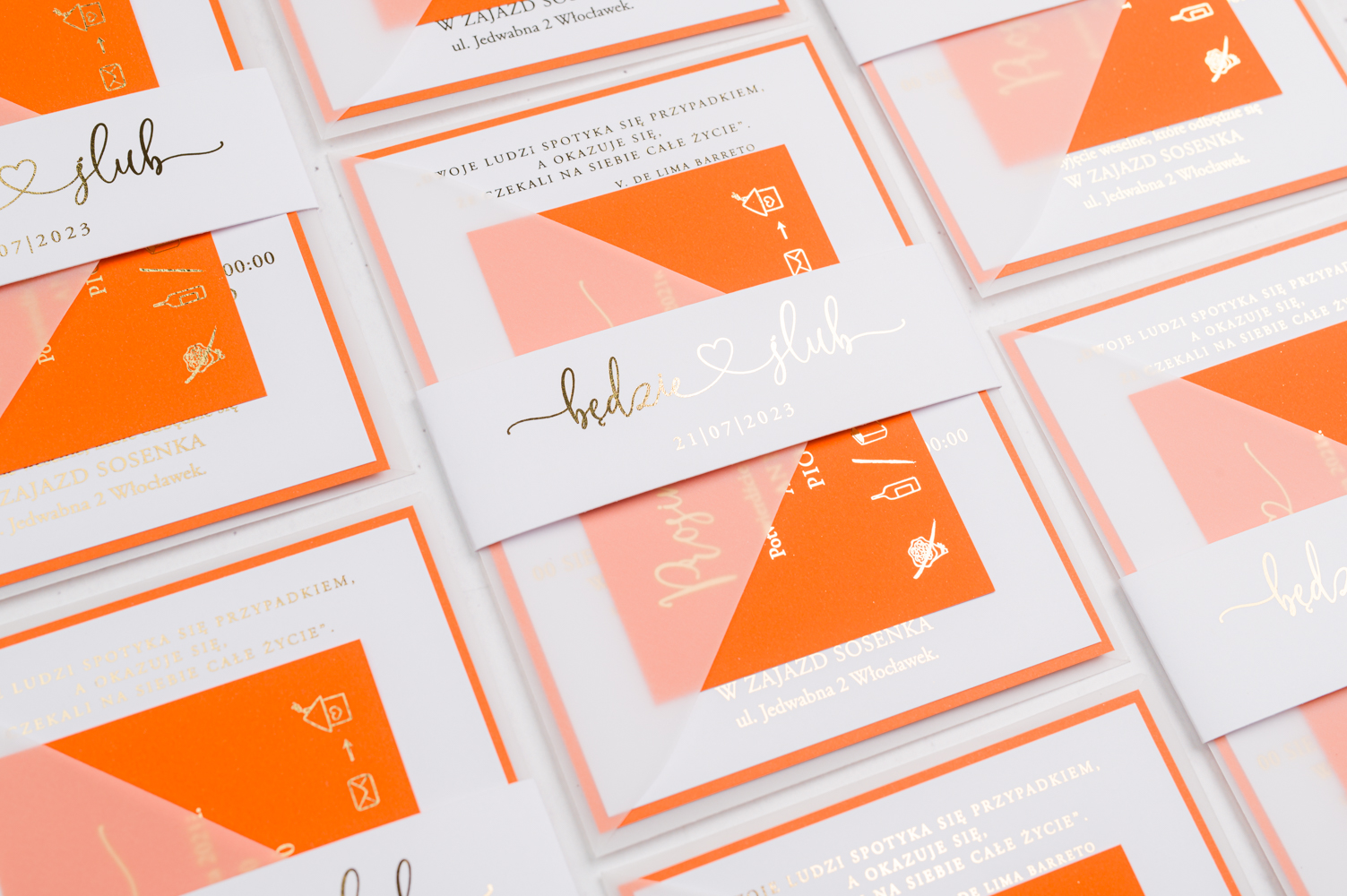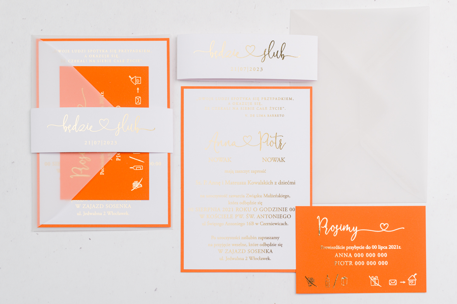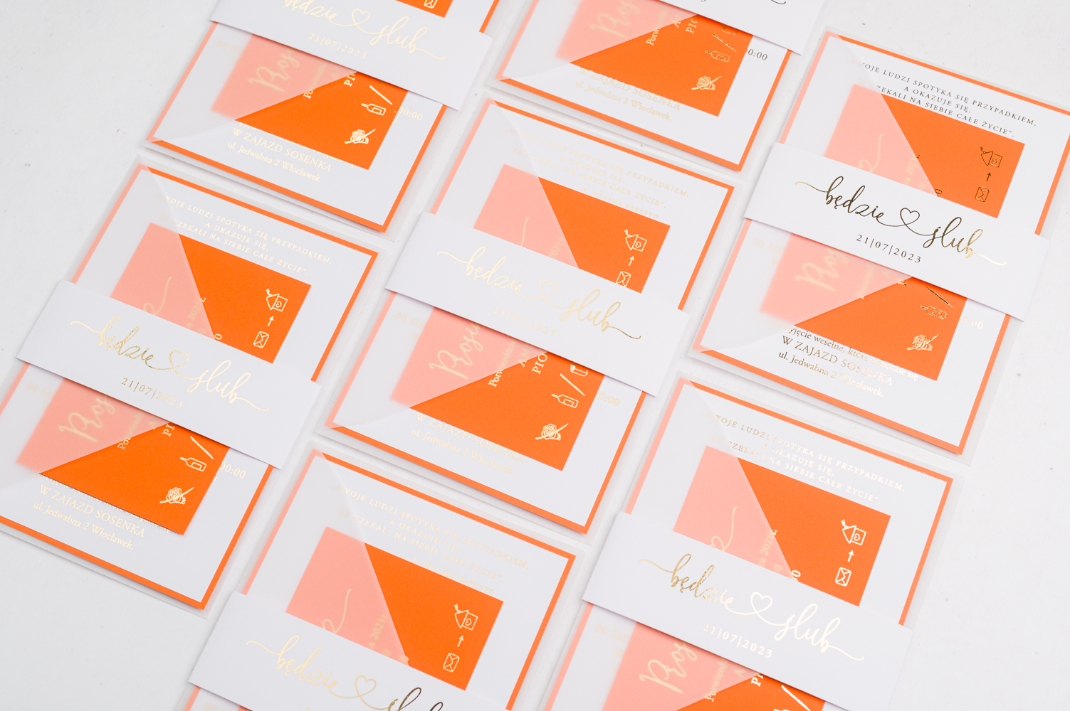 Do zaproszenia dołączona jest kolorowa koperta lub półprzezroczysta koperta z kalki.