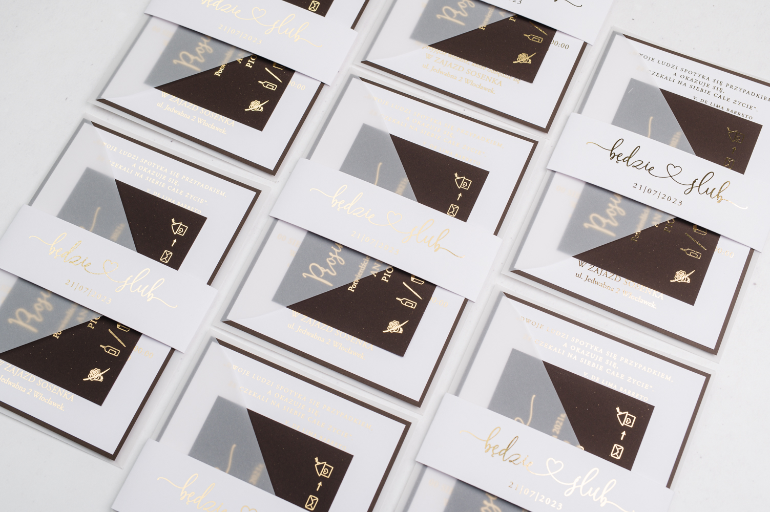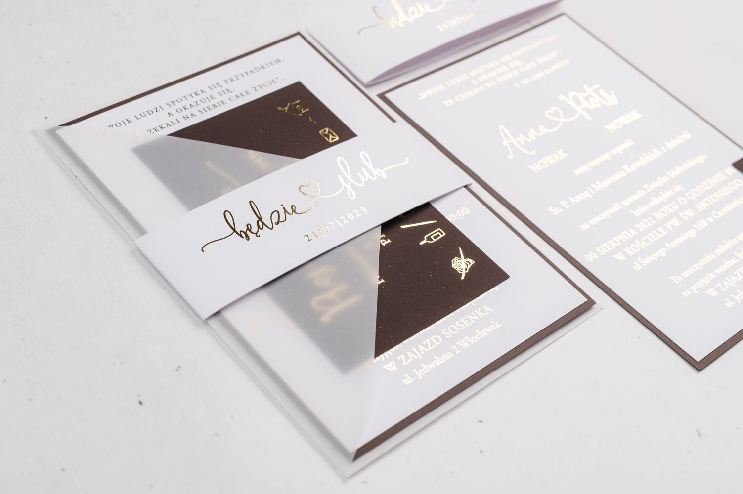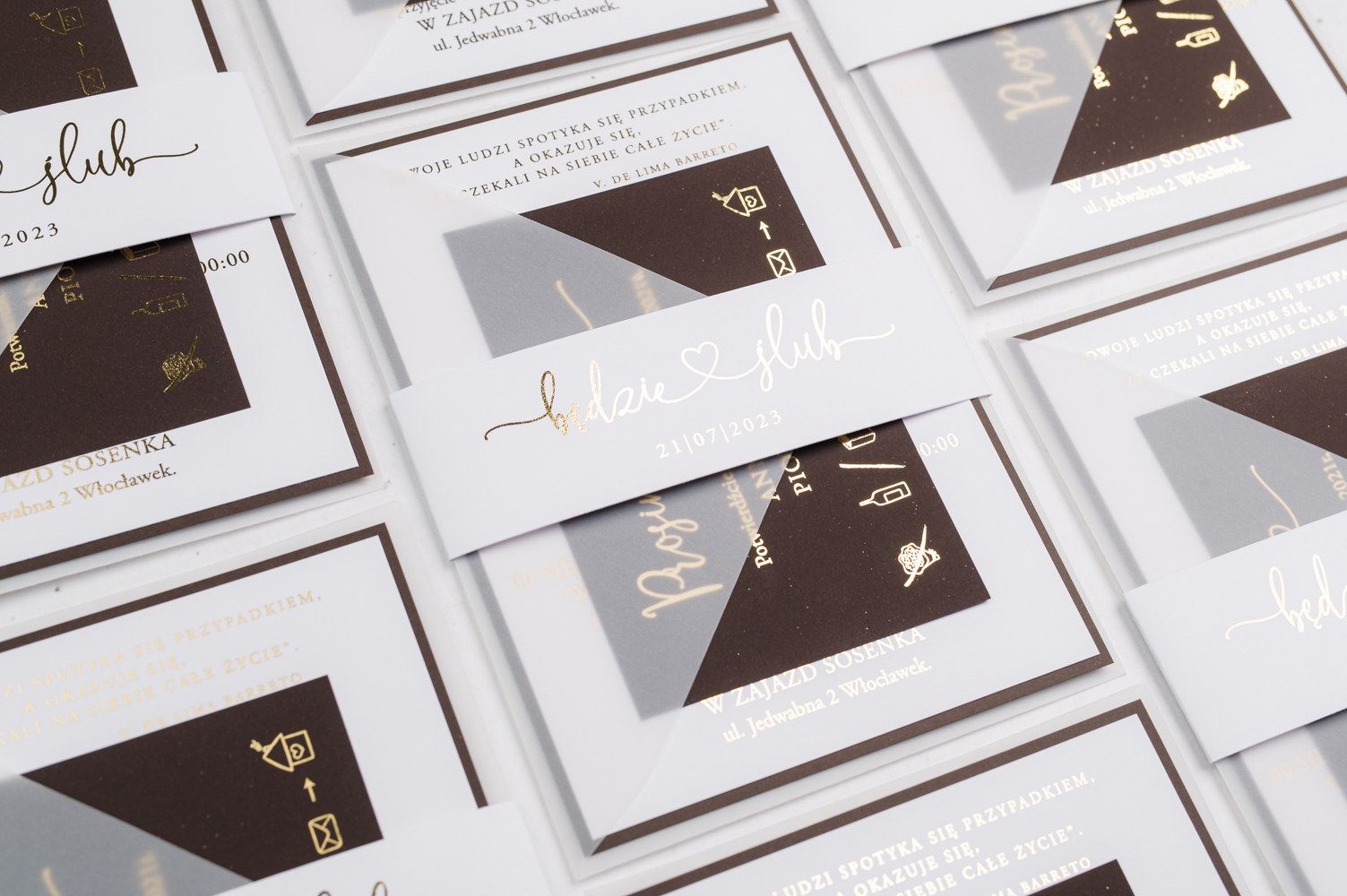 Do zaproszenia dołączona jest kolorowa koperta lub półprzezroczysta koperta z kalki.
