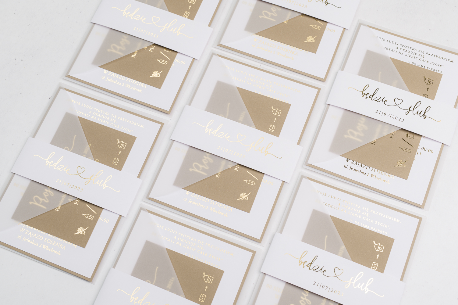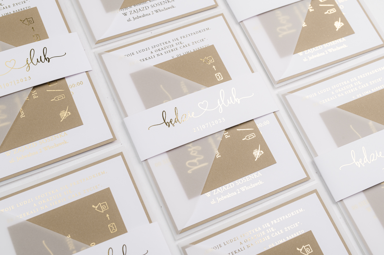 Do zaproszenia dołączona jest kolorowa koperta lub półprzezroczysta koperta z kalki.