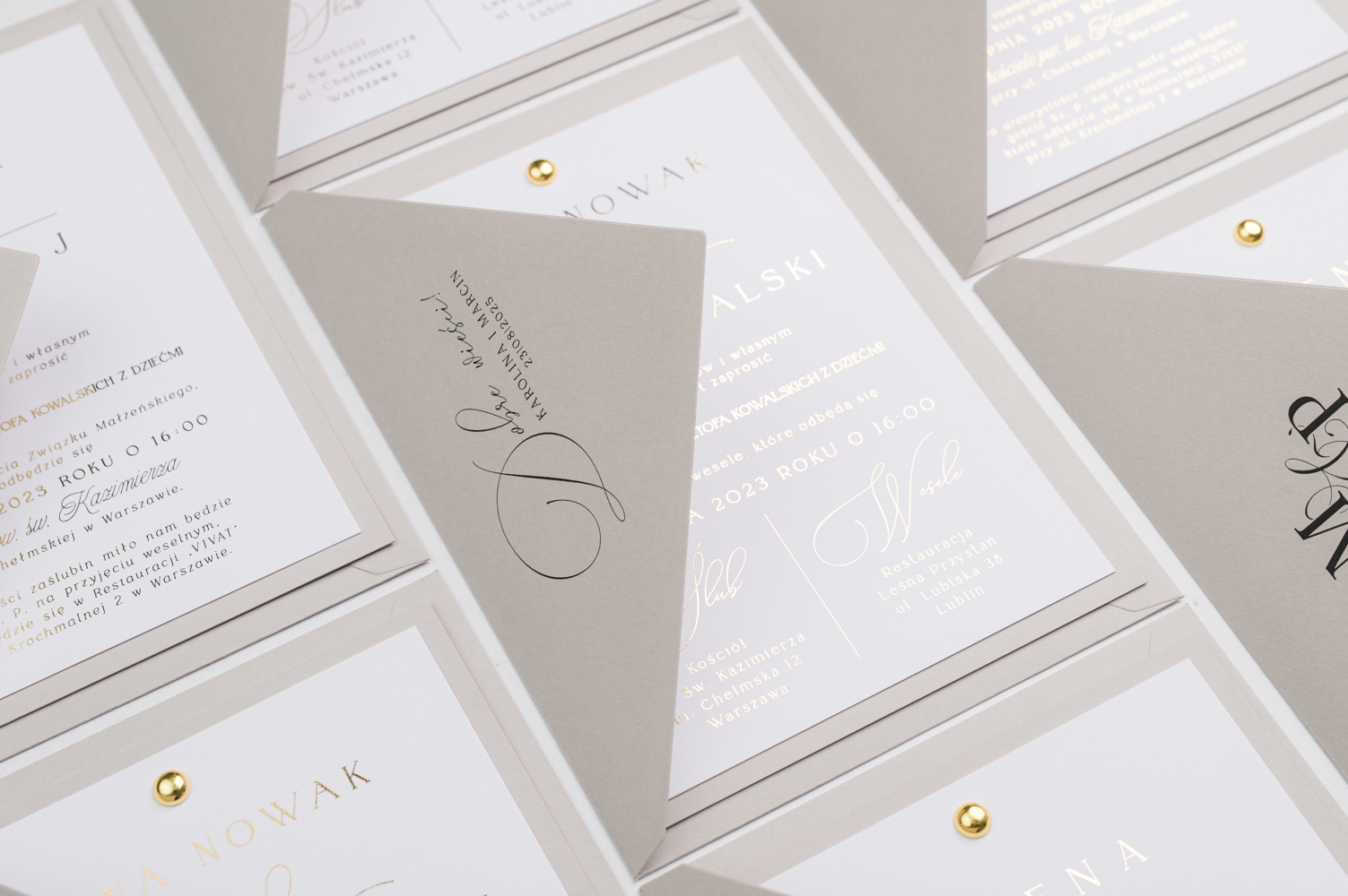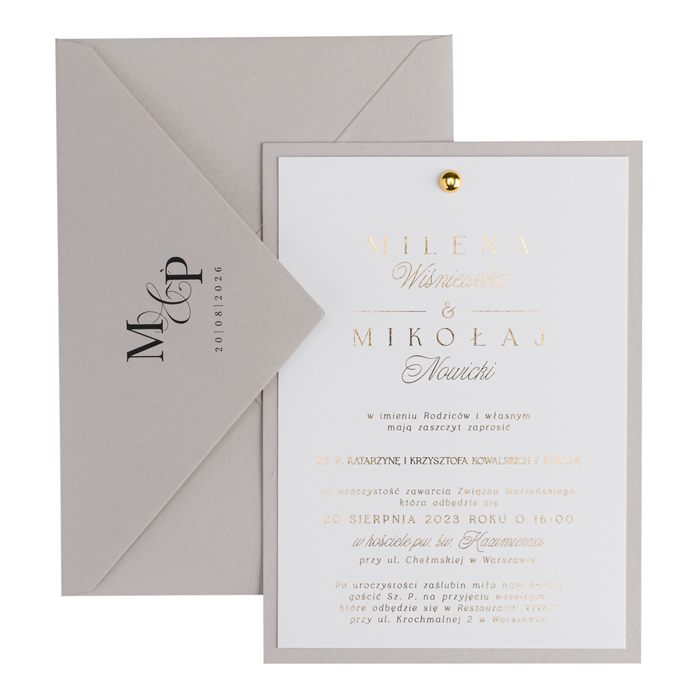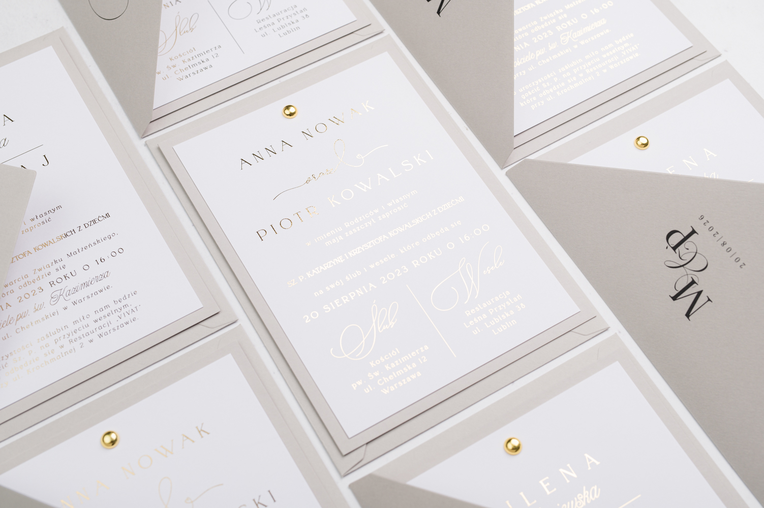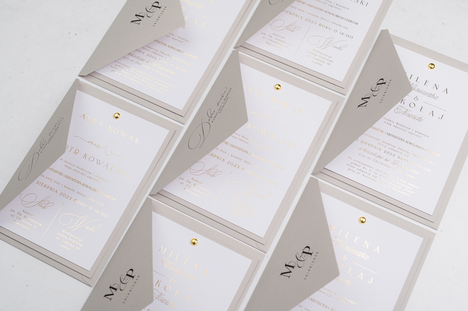 Dodaj pierwszą opinię dla Zaproszenia ślubne ze złoceniem i nitem cobblestone (ciepła szarość)