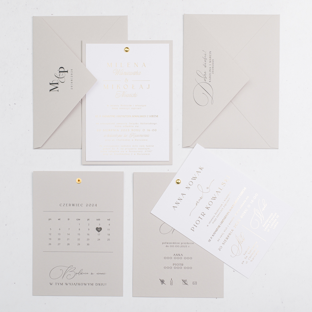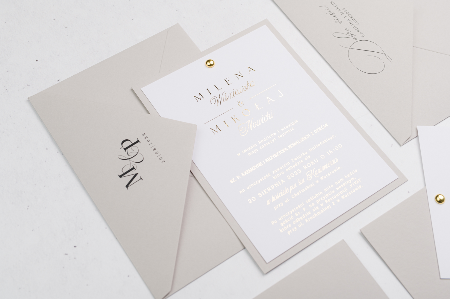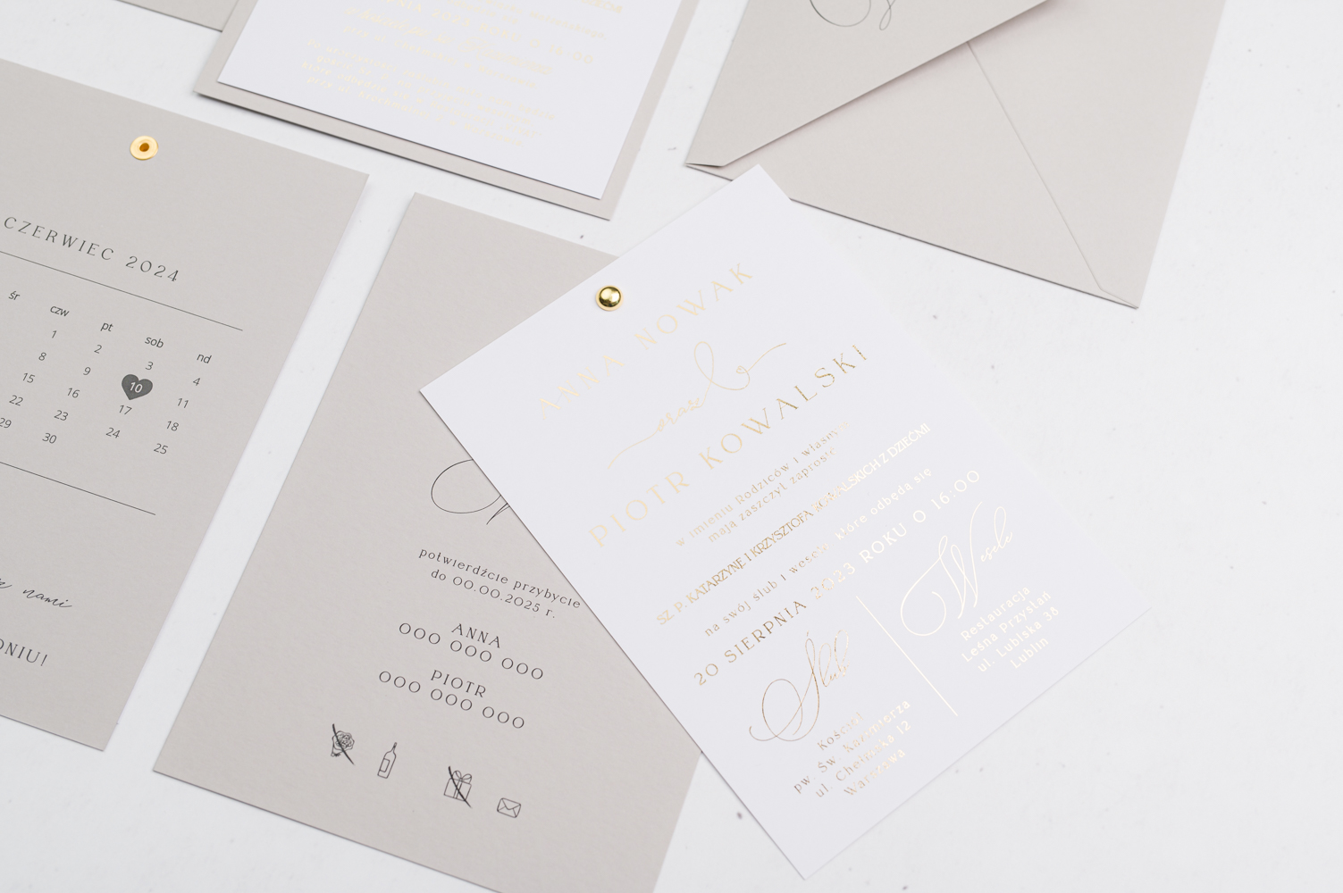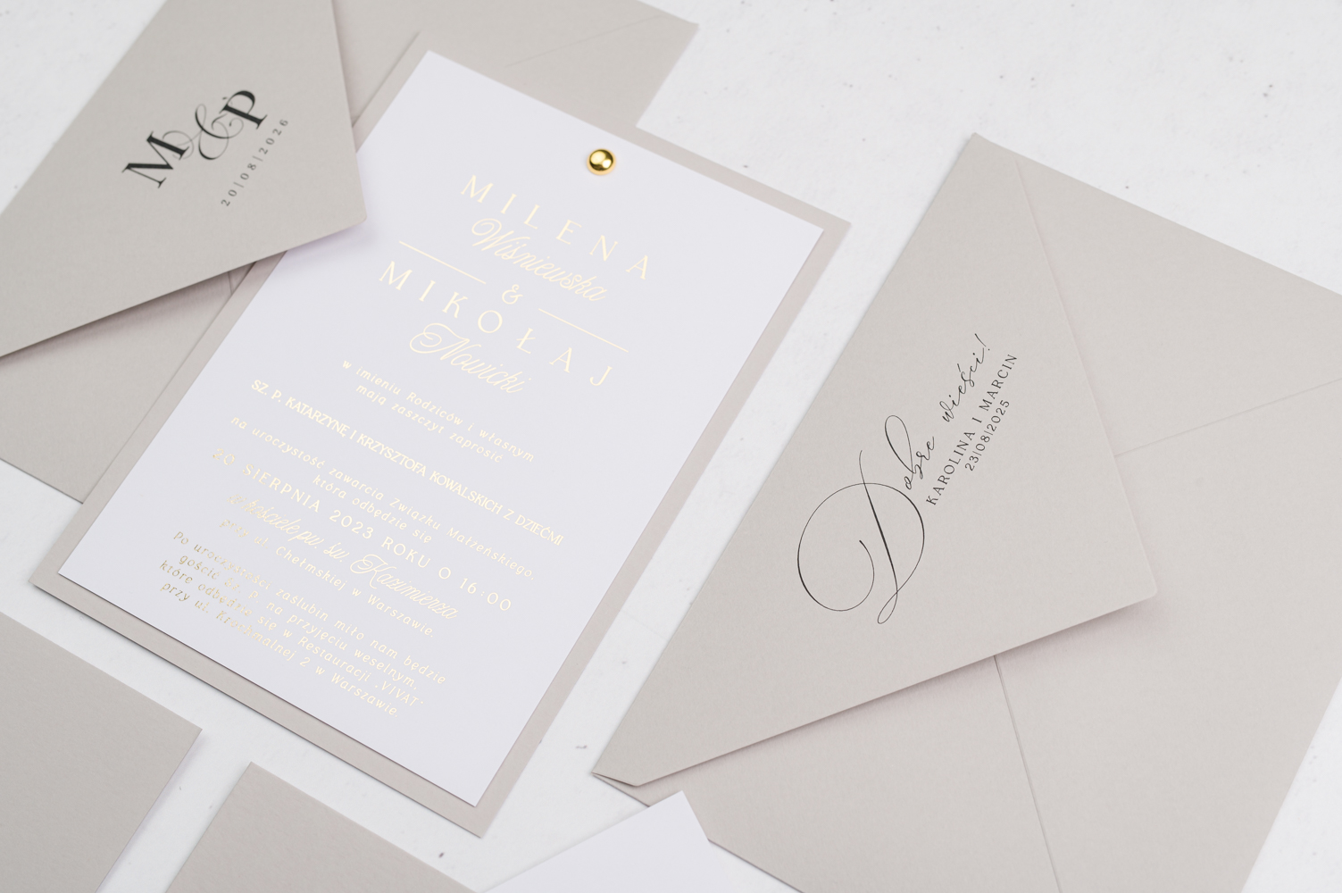 Dodaj pierwszą opinię dla Zaproszenia ślubne ze złoceniem i nitem cobblestone (ciepła szarość)