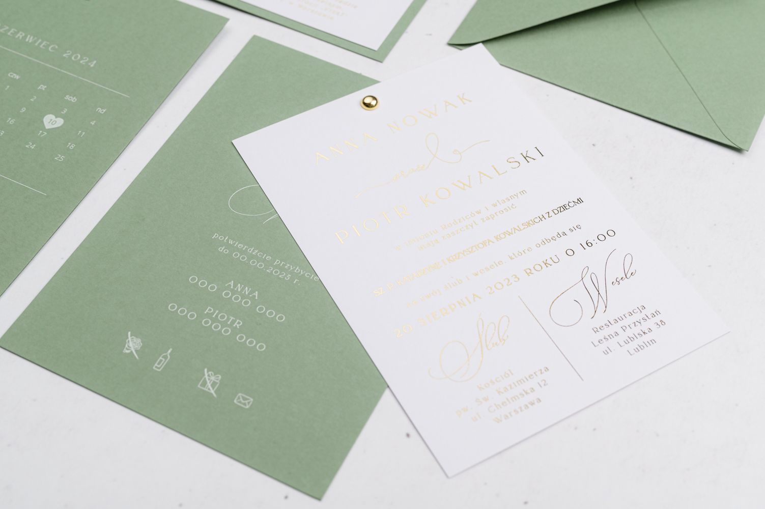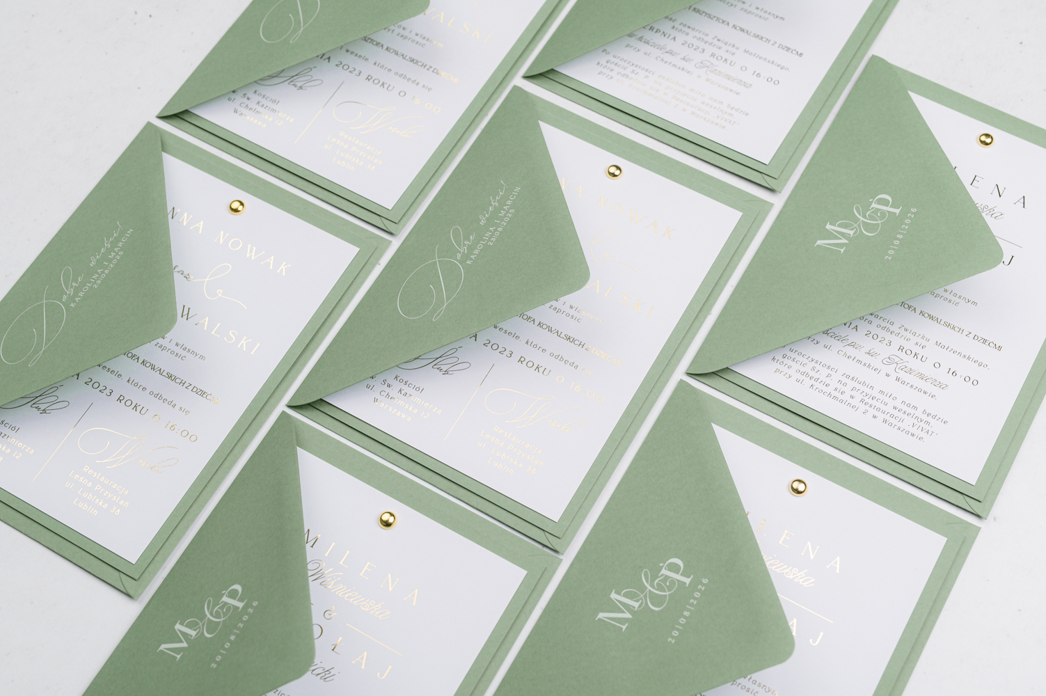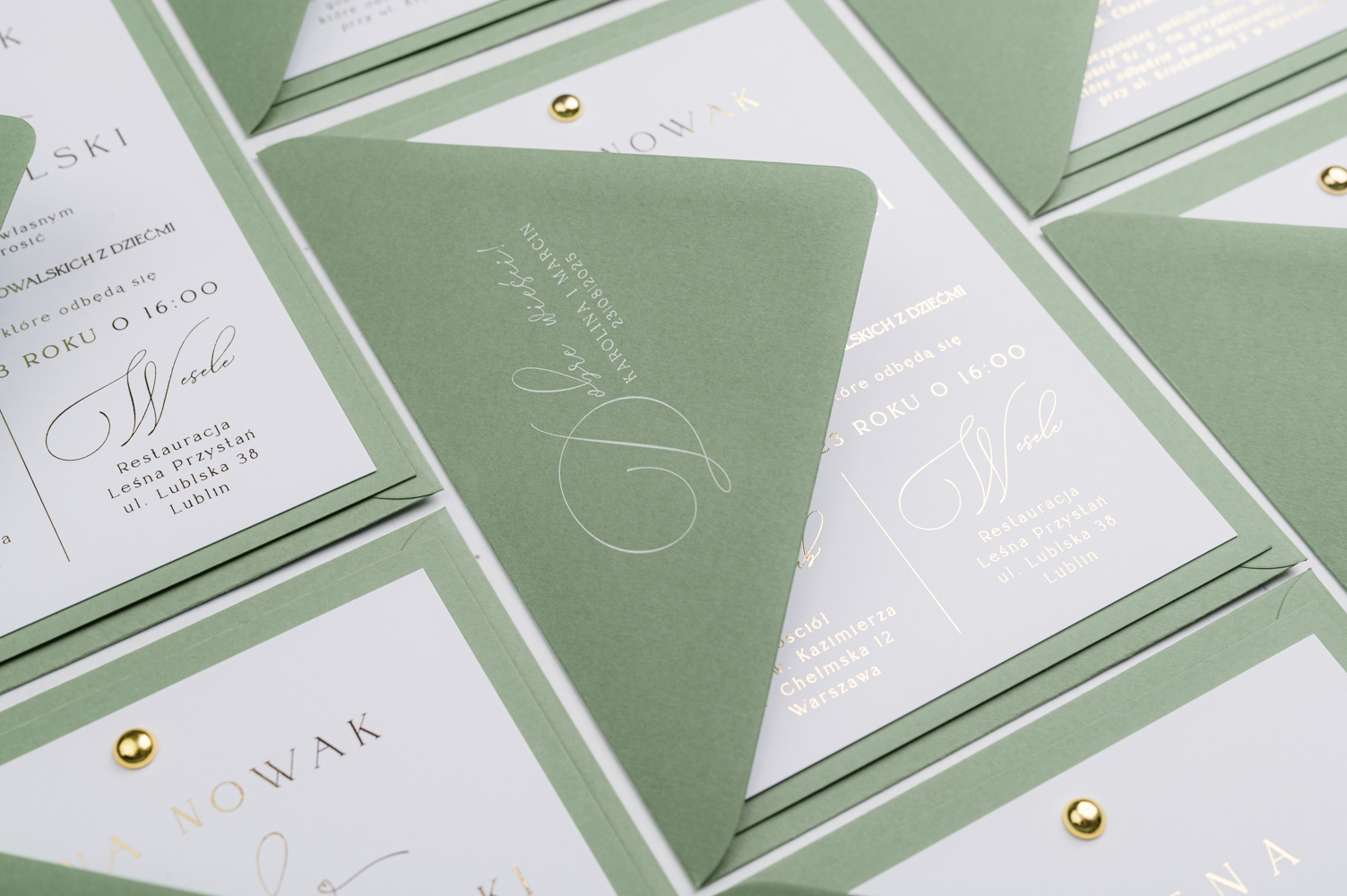 Dodaj pierwszą opinię dla Zaproszenia ślubne ze złoceniem i nitem matcha jasna zieleń/szałwia