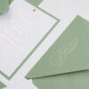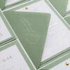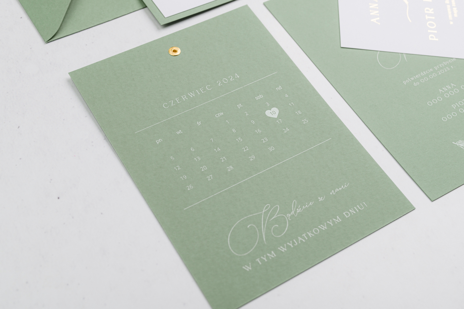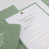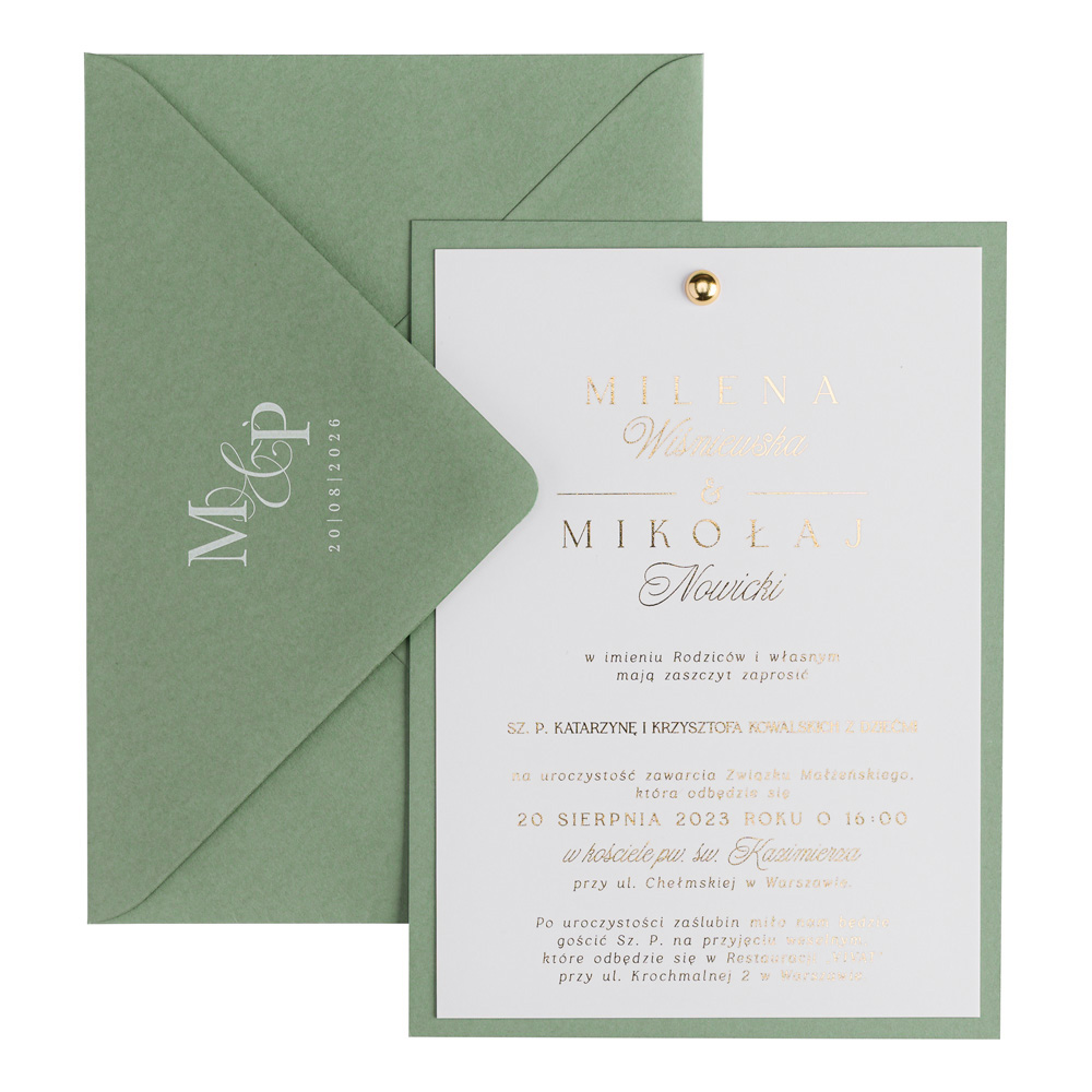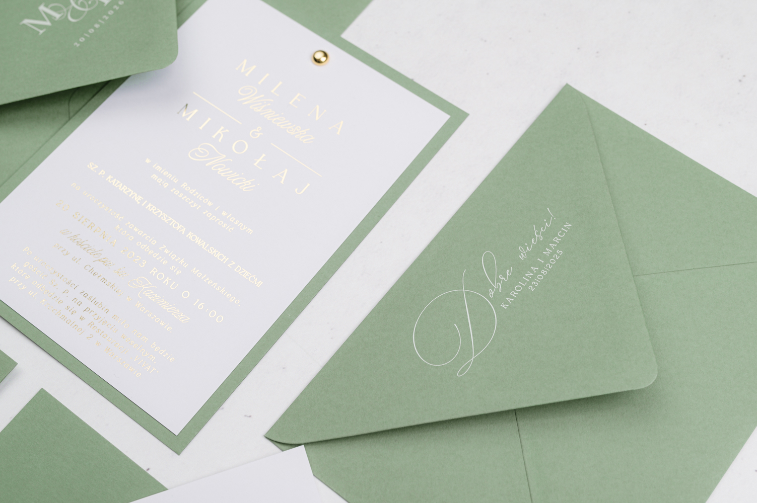 Dodaj pierwszą opinię dla Zaproszenia ślubne ze złoceniem i nitem matcha jasna zieleń/szałwia