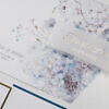 Nadruk wykonany jest na gładkim, białym papierze. Folder zamyka opaska z delikatnie transparentnej kalki ze złoconymi napisami.